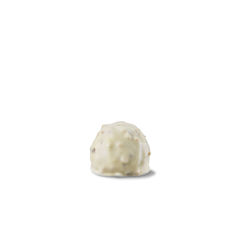 Un coeur fondant de praliné noisette sous une couverture de chocolat blanc, parsemée d'éclats d'amandes croquants.