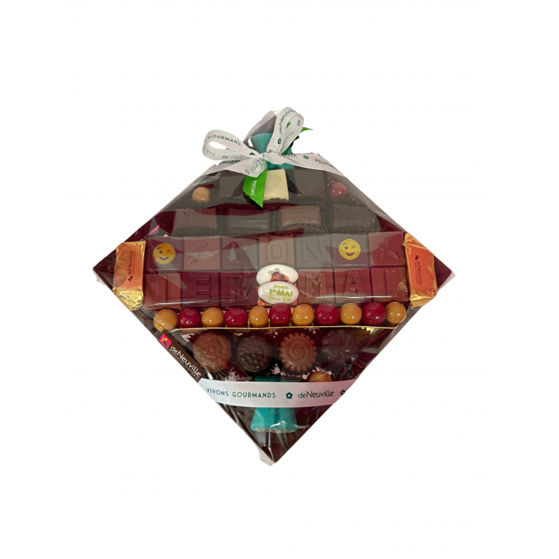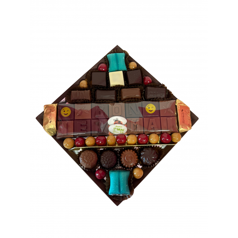 Plateau printanier (Bon 1er Mai) composé d'un assortiment de chocolats Tellement Français et de Coussins de Lyon