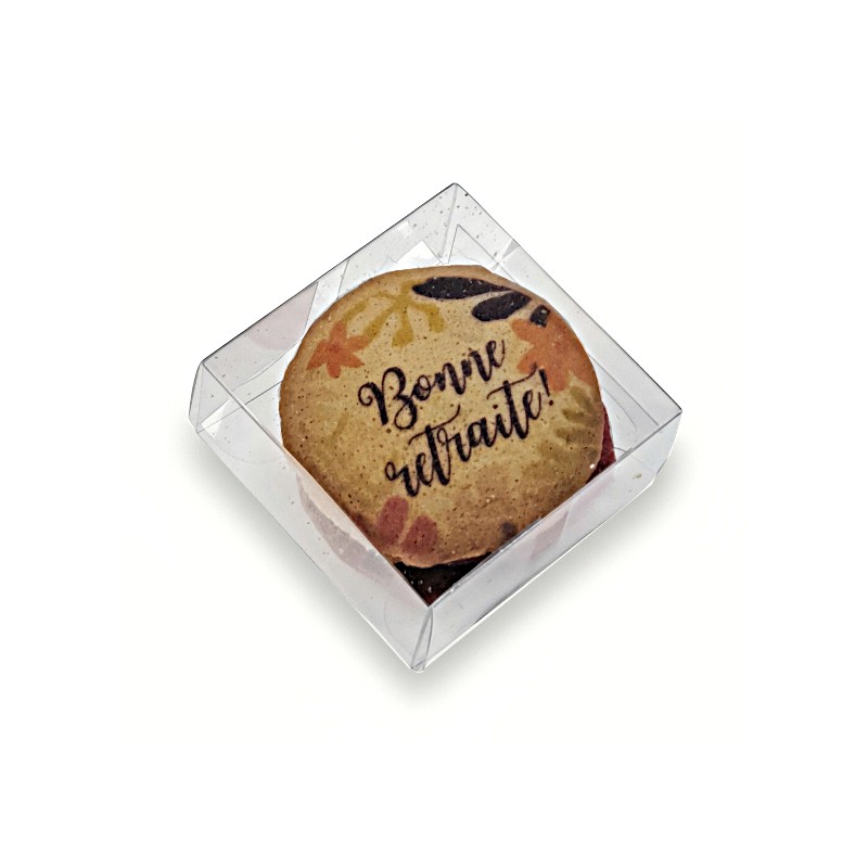 Etui de 3 Biscuits, dont 2 personnalisés "Bonne retraite" et le troisième, biscuit framboise sans personnalisation.