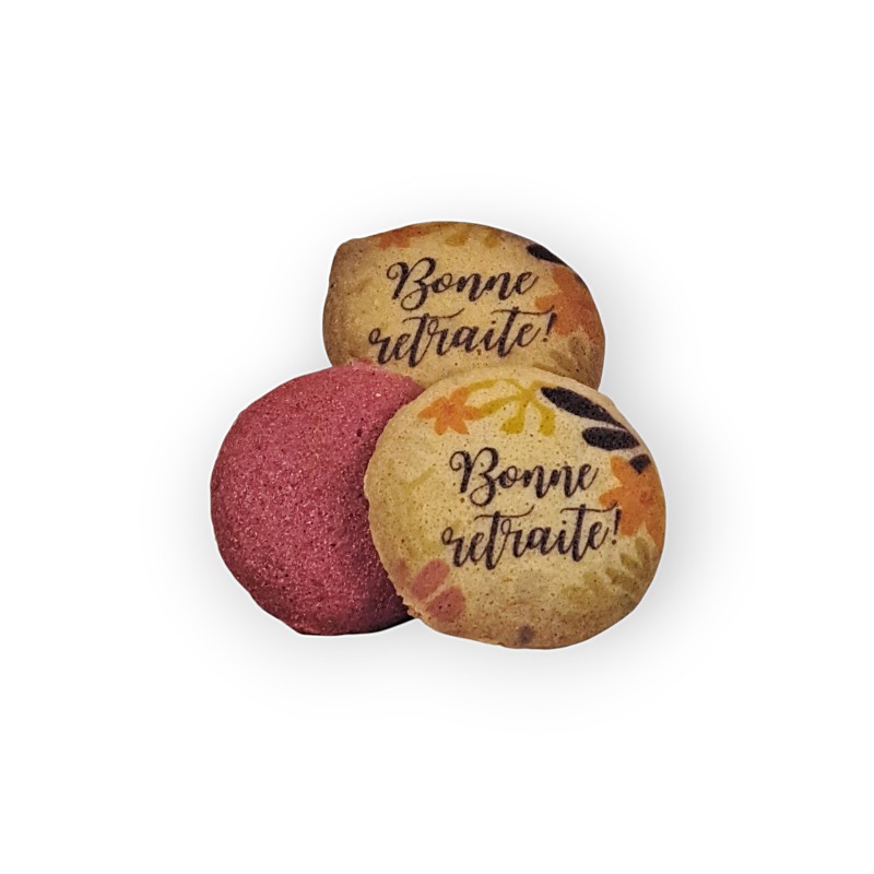 Il se compose de 3 biscuits dont 2 vanille personnalisés avec "bonne retraite" et un framboise sans personnalisation. Une encre alimentaire est utilisée pour l'impression.