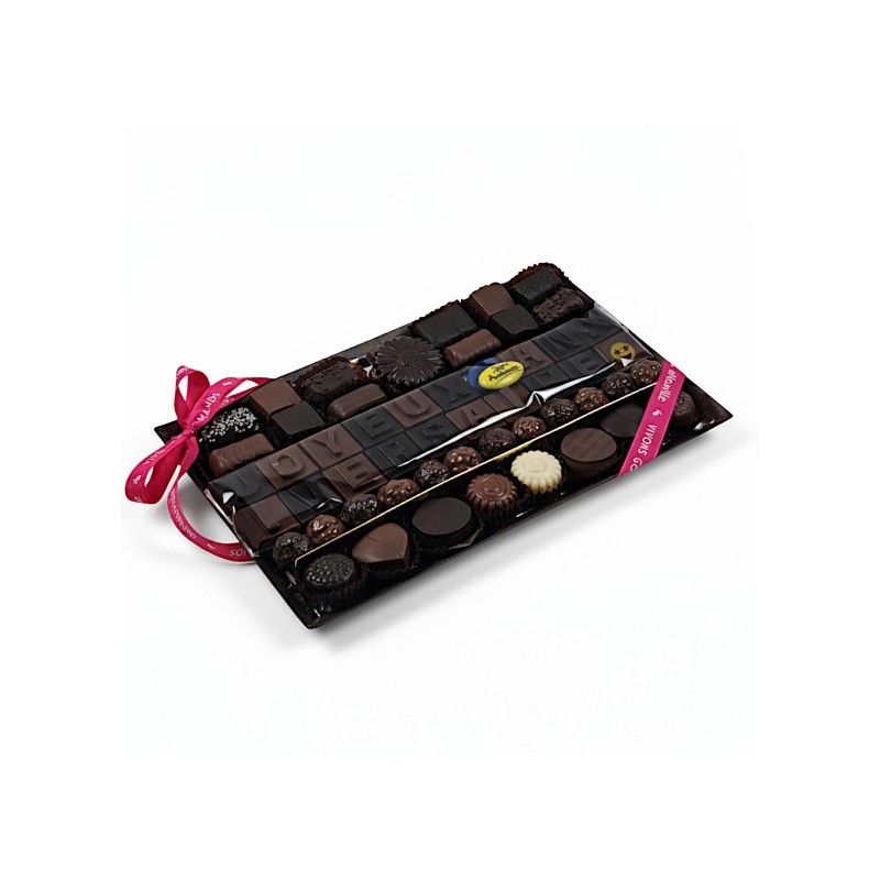 Vous êtes à la recherche d'une idée originale pour un anniversaire. Vous avez trouvé. Ce plateau se compose d'un assortiment de chocolats de notre gamme "tellement français" enrobage noir, lait et blanc. Aux différentes saveurs : pralinés intense, noisettes, ganaches parfumées, billes croustillantes, rochers, ...et d'un message à croquer "joyeux anniversaire".. Un présent qui ravira tous les gourmands.