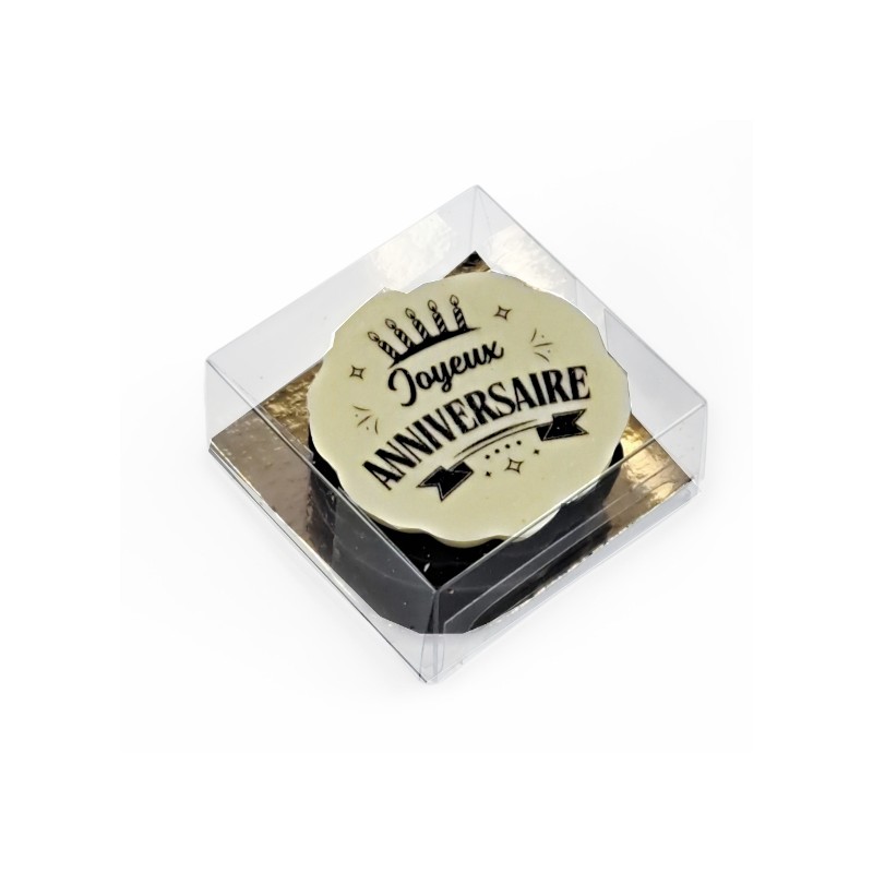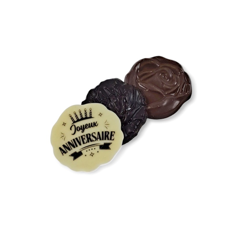 les palets chocolat noir, et lait sont neutres et le plalet chocolat blanc est personnalisé avec un message "Joyeux anniversaire".