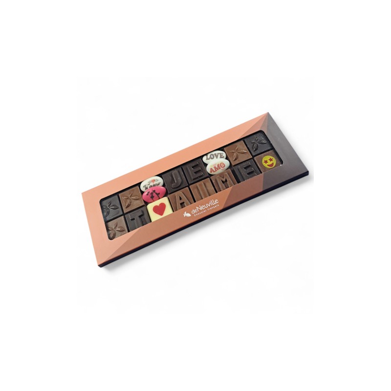 Ce message "Je t'aime" est composé de lettres en chocolat de tablette assorti noir, lait, et blanc.