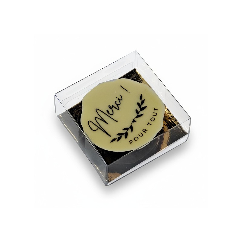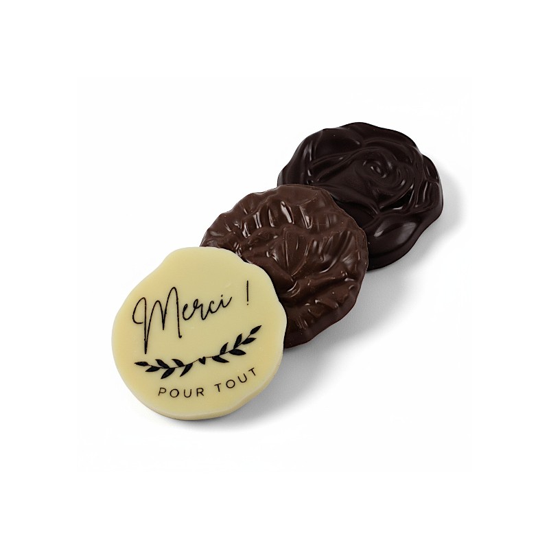 les palets chocolat noir, et lait sont neutres et le plalet chocolat blanc est personnalisé avec un message "Merci".