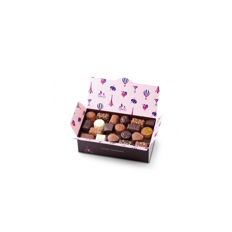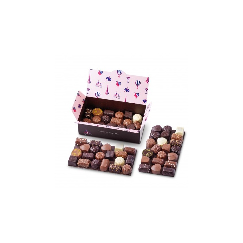 Assortiment de 57 chocolats fins, ganaches et pralinés parmi les 33 recettes de notre gamme "Tellement Français"
