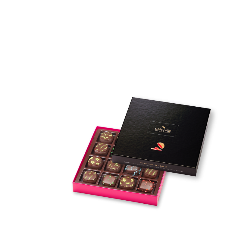 De Neuville vous propose une sélection de 16 palets aux recettes raffinées et originales. De savoureuses ganaches enrobées d’une fine couche de chocolat noir. Ces créations de Neuville sont issues de l'alliance parfaite des meilleurs crus de cacao et des ingrédients les plus fins, sélectionnés pour leur intensité aromatique. Une explosion de saveurs à chaque bouchée. Un coffret de chocolats idéal pour vos cadeaux d'affaires ou votre comité d'entreprise.