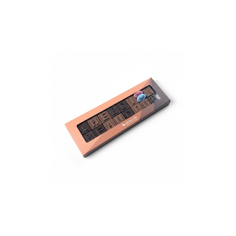 Trouvez une manière originale de remercier vos proches, grâce à ce délicieux message en chocolat. Ces savoureuses lettres en chocolat noir à 70 % de cacao, lait 37 % de cacao et blanc, pur beurre de cacao, sauront ravir les plus gourmands. Ce message à croquer fait un cadeau idéal, pour toutes occasions, anniversaire, remerciements, retraite, fêtes, message personnel, pour les comités d'entreprise ou vos cadeaux d'affaires.